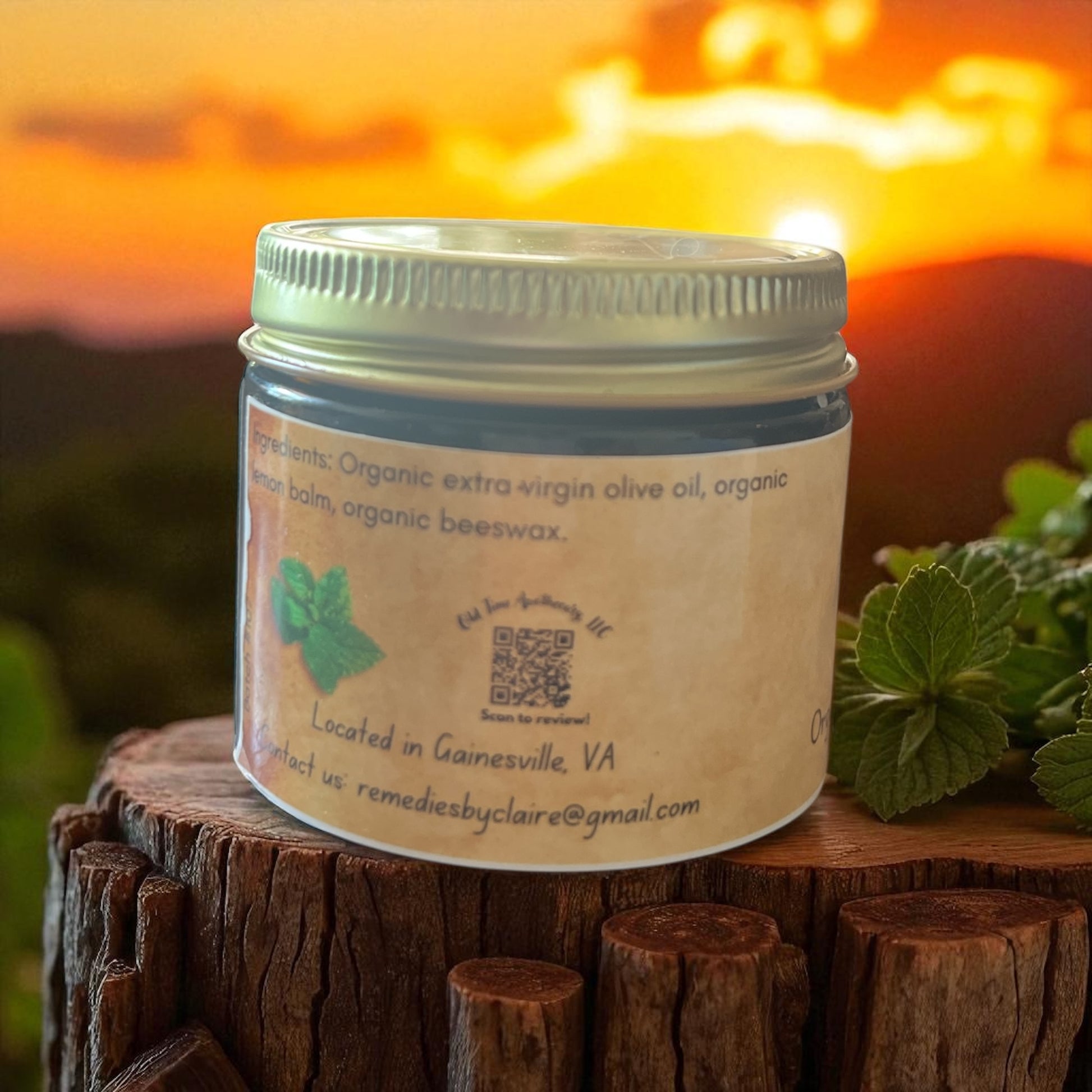 Ingredients: Organic extra virgin cold pressed Olive oil, Lemon Balm (Melissa officinalis), beeswax